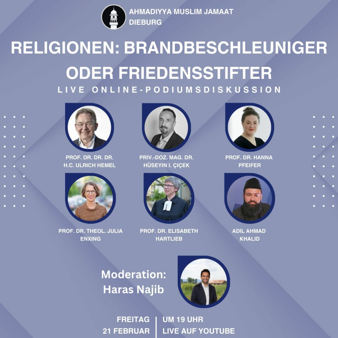 Vor diesem Hintergrund möchten wir gemeinsam mit Ihnen die Rolle der Religion in der heutigen Welt ausloten: Sind Religionen friedensstiftende Kraft oder vielmehr Ursache dür Konflikte? Welche Potentiale und Herausforderungen gehen mit ihnen einher?
