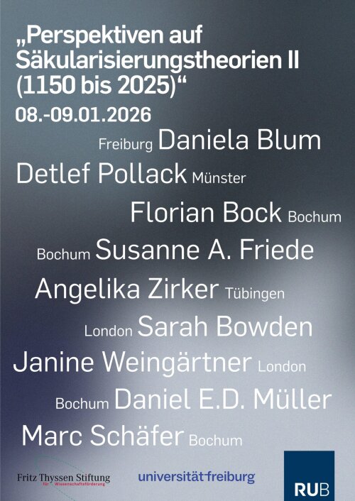 Am 8. und 9. Januar 2026 findet der internationale Workshop „Perspektiven auf Säkularisierungstheorien II (1150 bis 2025)“ statt. Organisiert von einem interdisziplinären Arbeitskreis der Universitäten Freiburg und Bochum, widmet sich die Tagung dem Thema der De-Differenzierung.