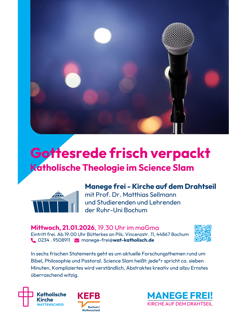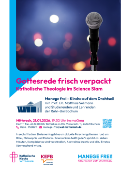 Am Mittwoch, 21. Januar, um 19.30 Uhr findet der Science Slam der Katholisch-Theologischen Fakultät statt! Herzliche Einladung an alle Interessierten, der Eintritt ist frei.