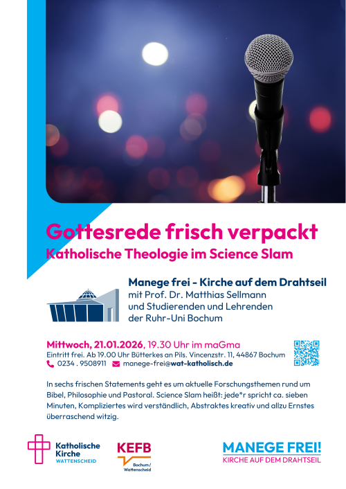 In sechs frischen Statements geht es um aktuelle Forschungsthemen rund um Bibel, Philosophie und Pastoral. Science Slam heißt: jede*r spricht ca. sieben Minuten, Kompliziertes wird verständlich, Abstraktes kreativ und allzu Ernstes überraschend witzig.