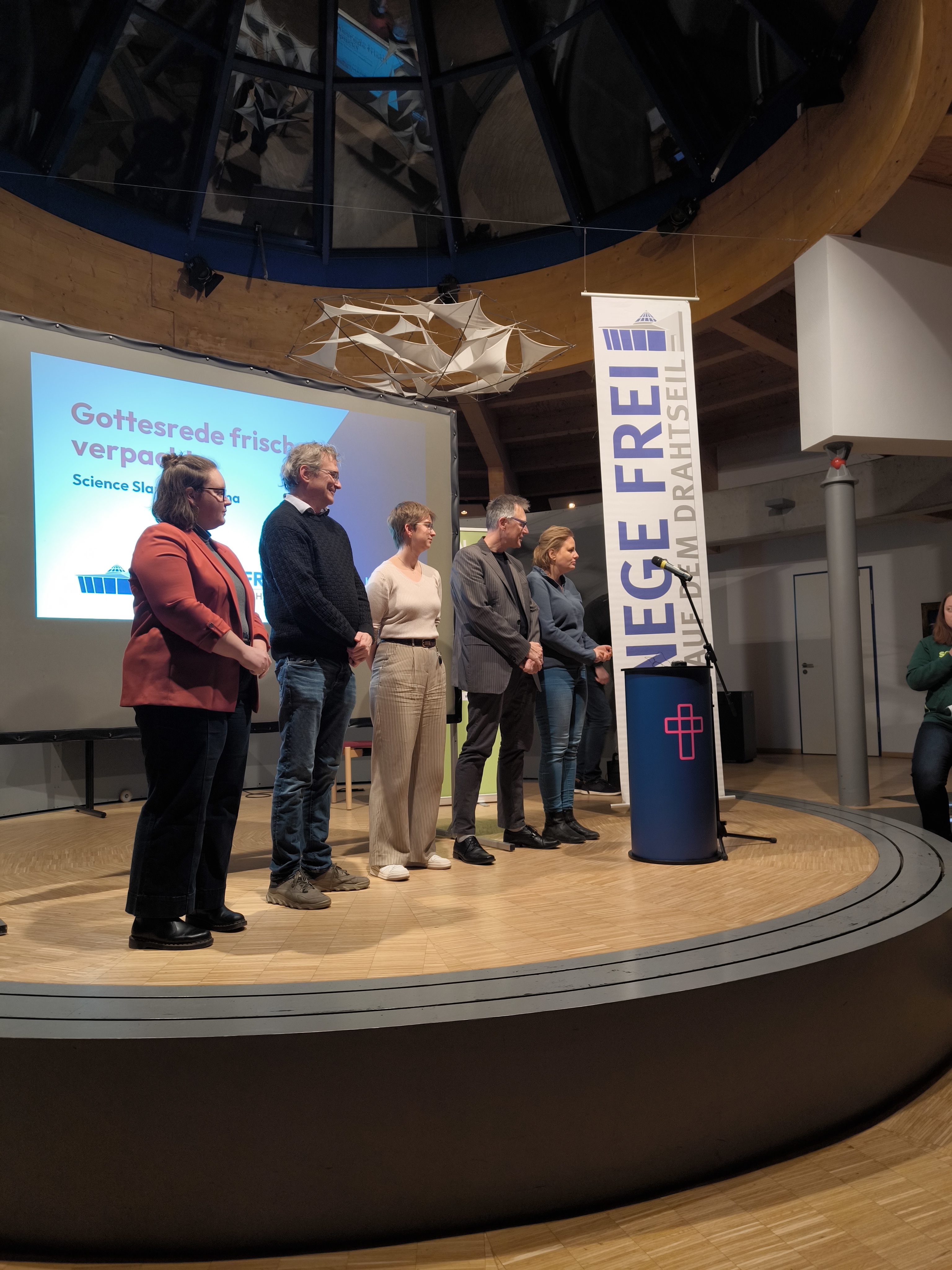 Nach dem letzten Beitrag entschied eine Jury, dass Wiebke Schwill sich an diesem Abend Siegerin nennen darf, lobte aber alle Teilnehmenden für ihre tollen Beiträge. Ein Beitrag fiel aus der Reihe: Prof. Dr. Matthias Sellmann sang ein Arbeiterlied auf die Theologie, gemeinsam mit allen Besucherinnen und Besuchern. Und ja, es gibt davon Bildmaterial. Bald auf unserem Instagram-Account zu finden.